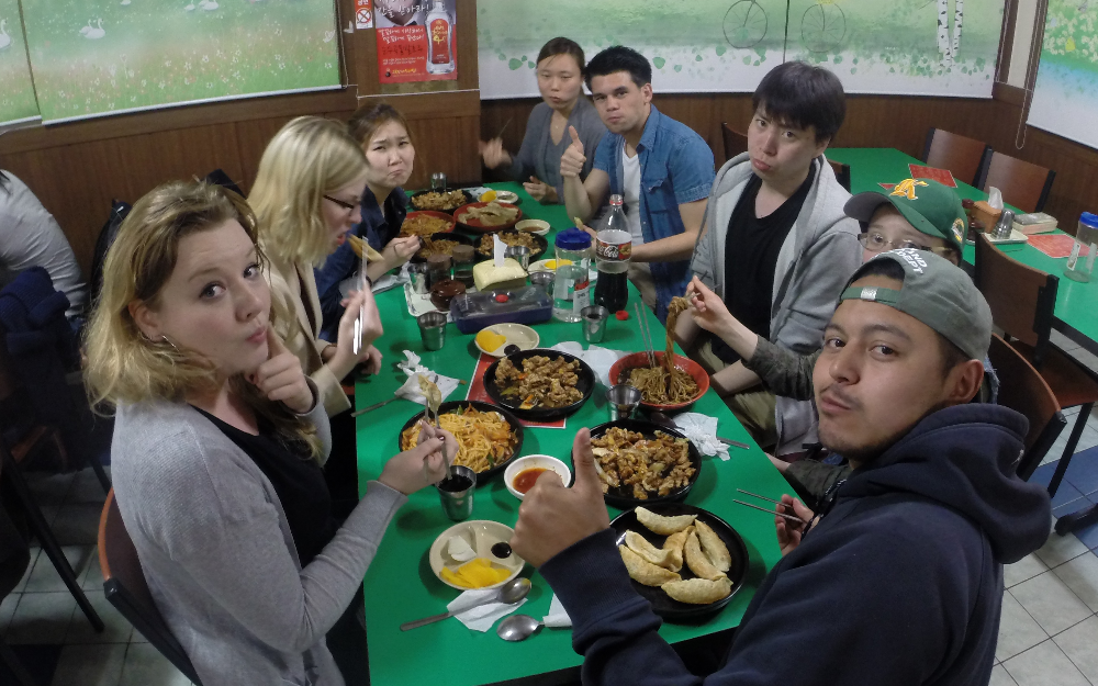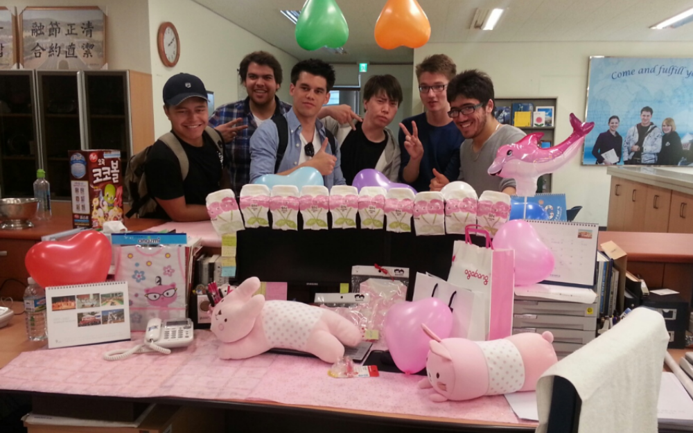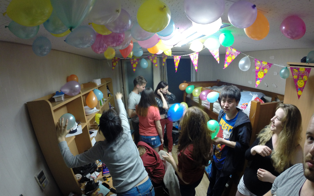 On Wednesday it was Ron’s birthday. We gave him a good boost at the morning singing the ”Happy birthday”–song in Korean! We were at the Korean class and our teacher helped us with the Korean version of the song. Yet we had planned a bigger surprise for Ron. We knew that Ron was going out on Wednesday night, so the plan was to decorate his room with balloon, festive ribbon and everything. Ron was totally surprised when he got to the dorm before curfew and opened the door of his room and we were inside, in the middle of the festive room.